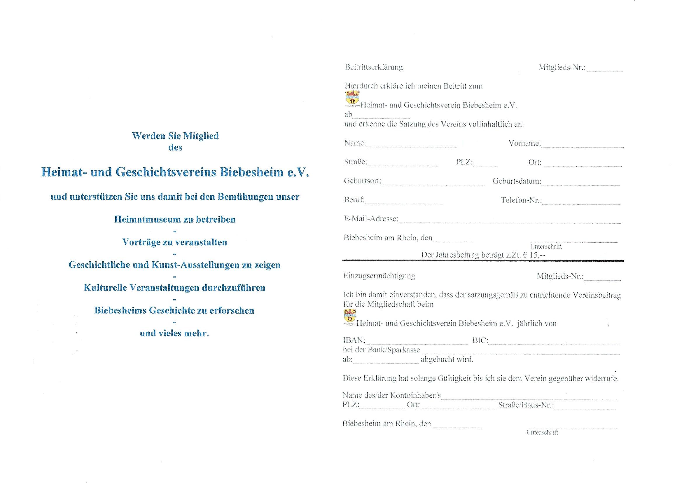 Wir würden uns freuen, wenn Sie die Beitrittserklärung ausfüllen und im Heimatmuseum abgeben würden oder aber auch in den Briefkasten des Vorsitzenden Neugasse 3 in Biebesheim am Rhein einwerfen würden. Selbstverständlich können Sie uns die Beitrittserklärung auch per E-Mail an